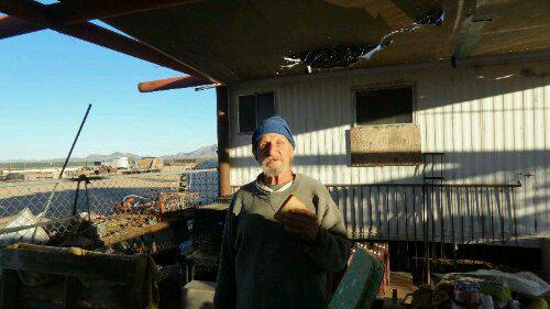 He lives in the desert with a few cows and a lot of scrap machinery. A lot of scrap machinery. He leads a simple life, eating mostly canned food, taking care of his cows, and sorting through the items on his land and repairing them. I guess he's had trouble with neighbors and the government about his land, but he's managed to handle it so far.