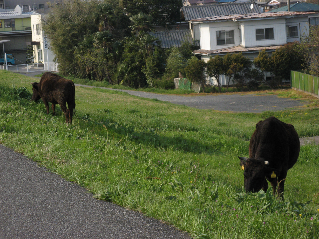 Yes, there are two cows on the side of the bike path. At first I didn't even notice--perhaps a throw-back from travels around Lawrence. Once you get out of the city limits of Lawrence cows are pretty common, though of course they aren't grazing next to the road but are behind barbed-wire fences. But this is Saitama city, and cows are quite uncommon anywhere but Hokkaido--there just isn't room for them to roam. But these two seem to be quite famous--they are pictured on the cartoony map of the Arakawa bike path that appears in a sign along the path.