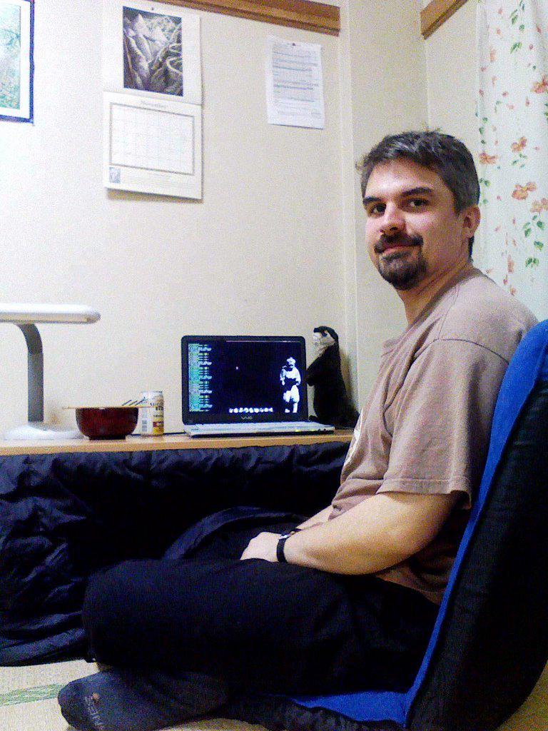 I was able to get a particularly good deal on this setup, something that just adds to my enjoyment. A reasonable kotatsu—not cheap but presentable as a table in winter and summer—usually costs 15,000-20,000, an amount I just can't afford at the moment. I frequent the thrift stores around here—and Adachi appears to really be one of the best places in Tokyo for them—but I wasn't able to find one that fit my plans, a rectangular affair that would still fit well in my room. I'd found many square ones, and a couple rectangular ones that just seemed too big, but in the end I managed to find a kotatsu table, a frame with space for the heater and the table-top, for 1000 yen. I think it was new, though I scratched it a bit carrying it home (an hour long ordeal). It fits perfectly in my room. I did some measurements and found I could easily put in a heater, and today I headed over to Akihabara (the electronics district; I could have easily gone somewhere here in Adachi, but decided to head there since I hadn't been for a while), picked one up for 4000 yen, and now I'm set. I got exactly what I wanted for a third the cost of a new one, and for a price comparable to the cheaper, older setups I had seen at the thrift stores. Very happy.