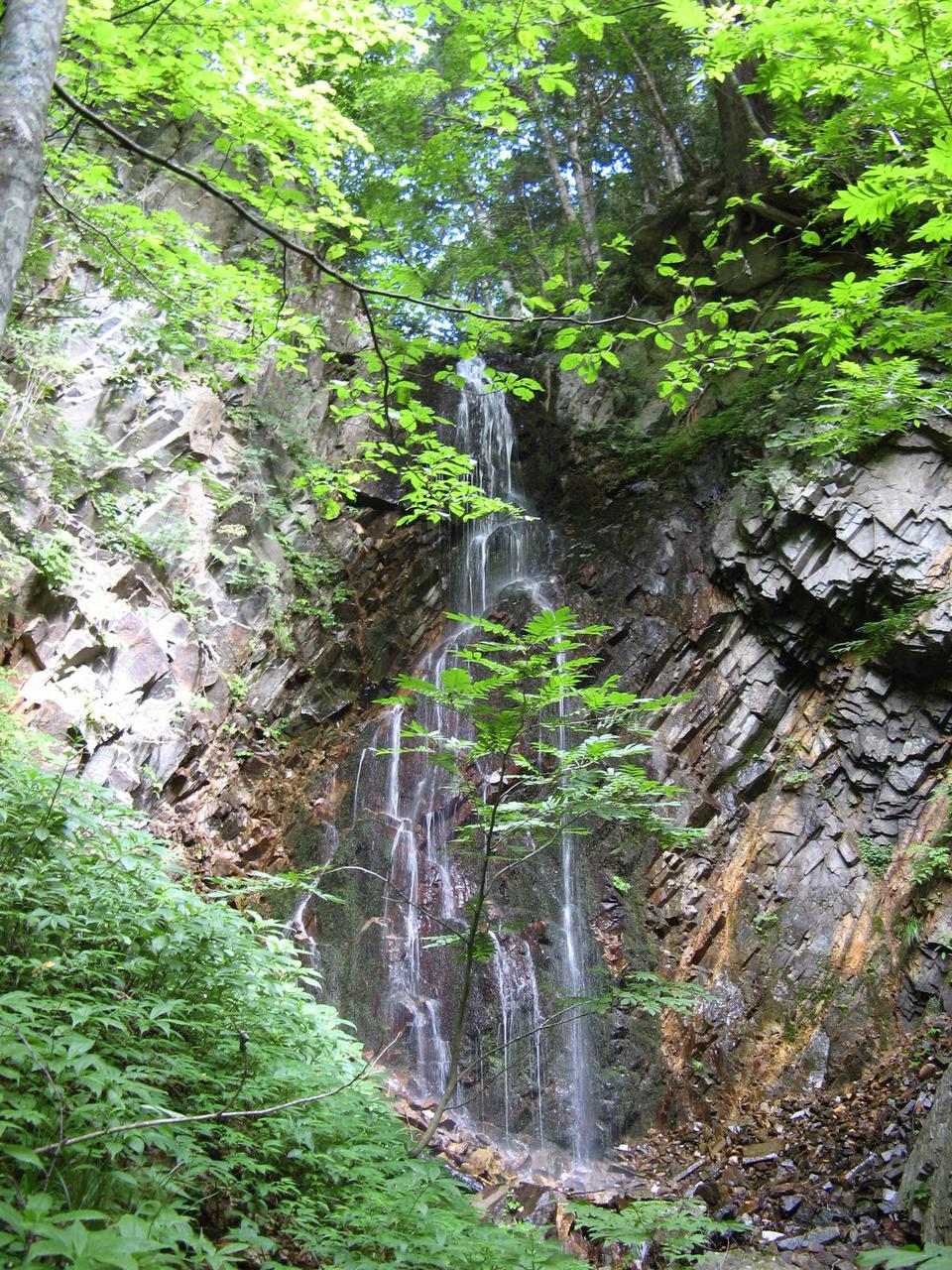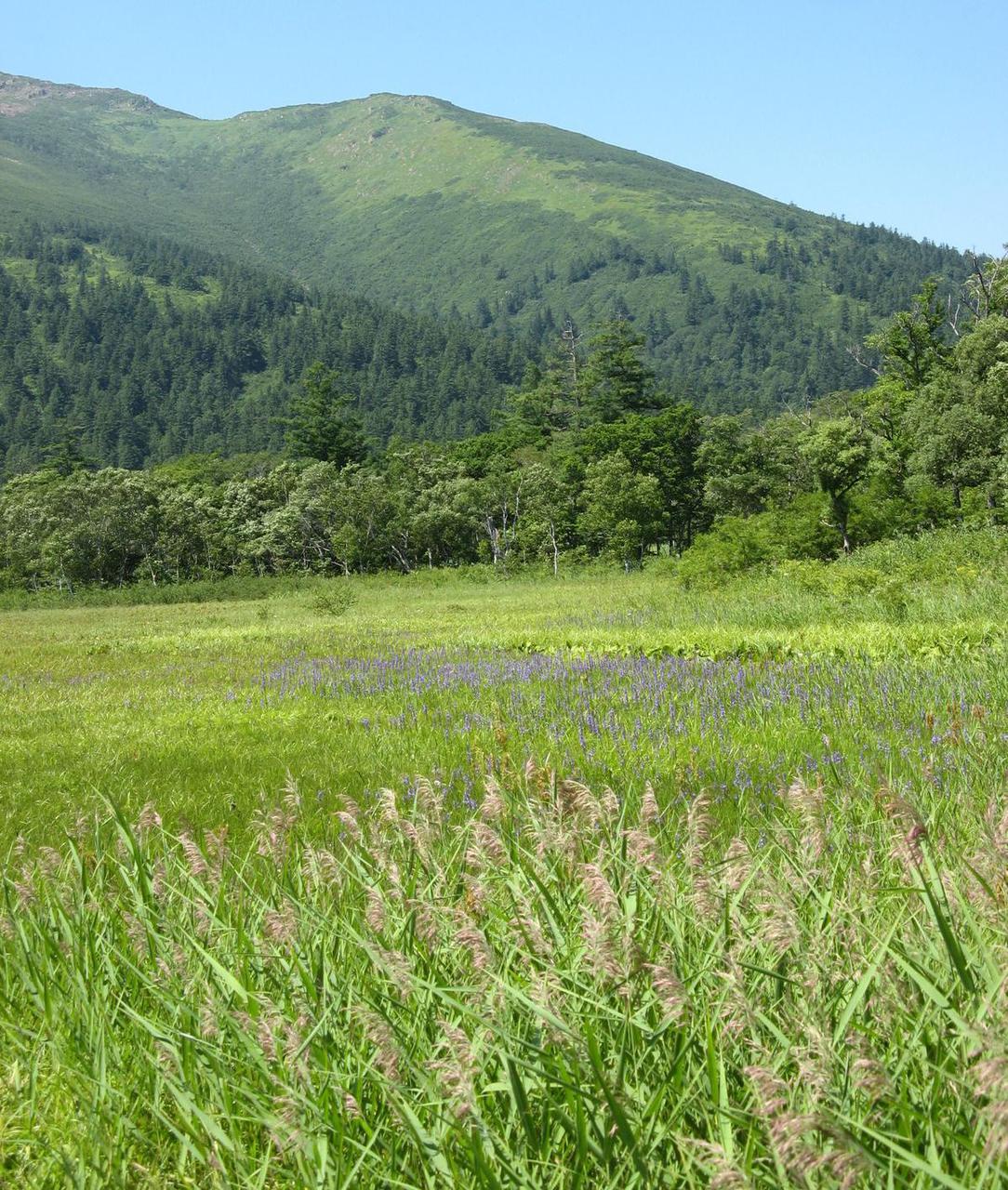 After passing the peak of Mt. Nenakusa, the trail descends into a valley, the Kinu River valley. A road comes from the east to the Kinu Marsh Onsen (Kinu Marsh Hot Springs), a large structure also called a "mountain hut", though "resort" would be more appropriate. I'd hoped for a vending machine in my decadent hiker dreams, but no luck.
