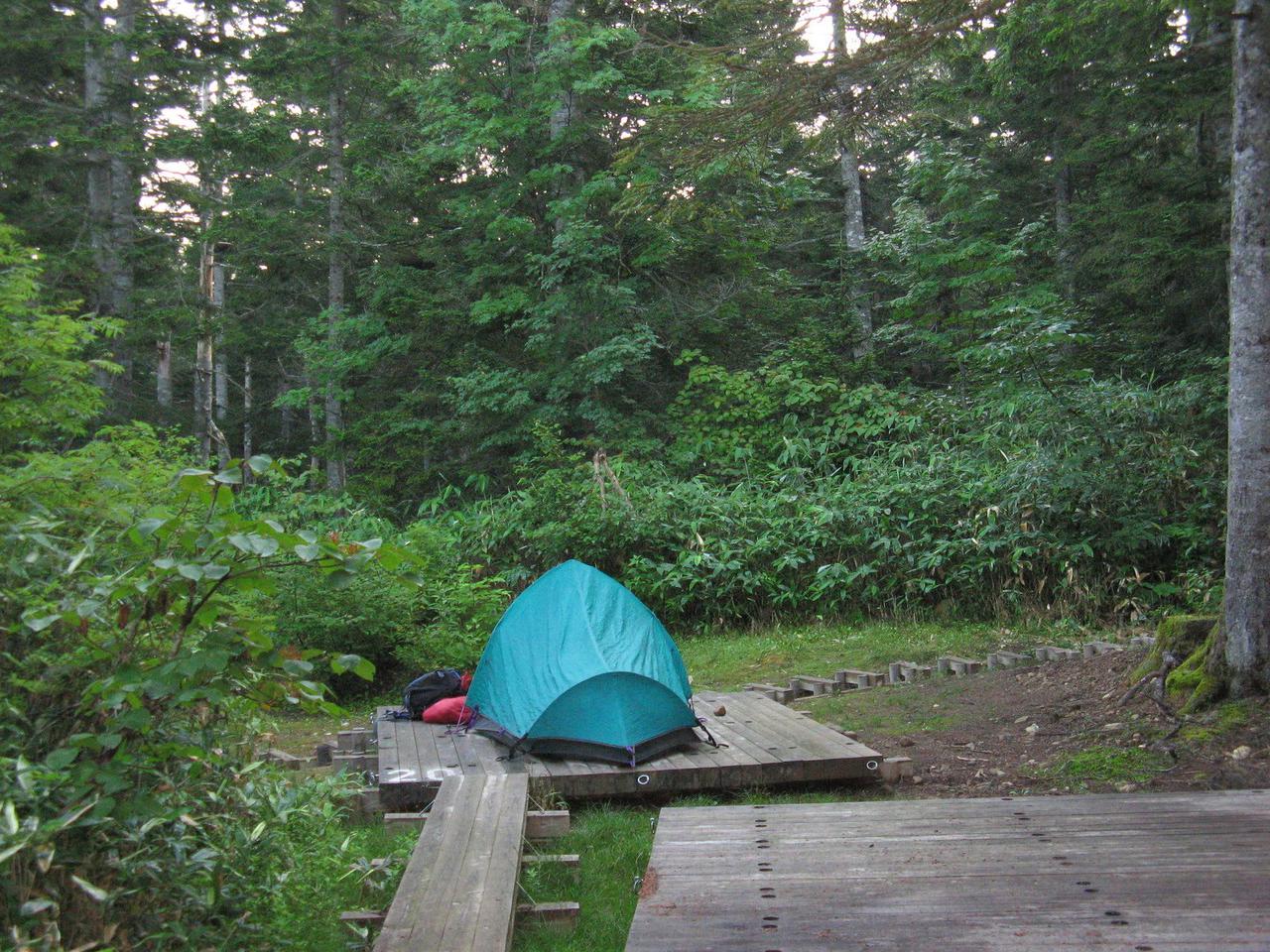 The eastern most campsite, where I stayed, is unique in that the sites are on wooden platforms. The campsite is actually the first man-made structure on the trail once you reach Oze, so I walked through, wondering how I would pitch my non-freestanding tent there. It took a while to get to the reception desk, in a large building called the Oze Huette (from German for "hut") and asked for the site furthest from the other campers (yay!). There were only a few campers, so I was off by myself though, had there been more campers I might have been surrounded by others. For reference, sites 8 and 20 are separate from other sites: you'll be able to hear other campers, maybe, but won't be able to see them!