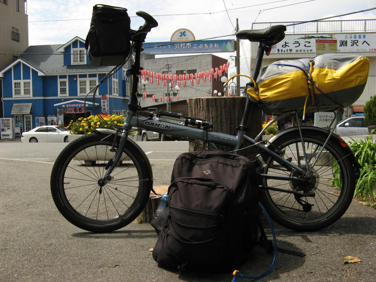 To my surprise, both the Joban, a commuter train that drops truckloads of folks from Northern Chiba on Tokyo every morning, and the Yamanote had quite a bit of free space. Once in Shinjuku, I jumped on the Azusa rapid for Kobuchizawa, and I was off! I wasn't able to get a seat, but my bike makes a fair chair when folded. I was exhausted but couldn't sleep; still, the two and a half hours were over quickly.