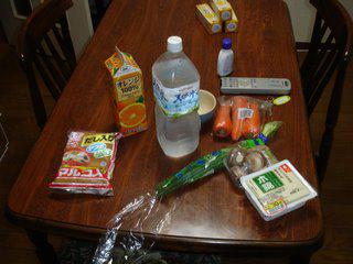 The kitchen table, with the assorted foods I used to make breakfast, a healthy portion of miso soup with shiitake mushrooms, green onions, and tofu.