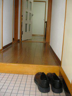 You can sit on the floor because they aren't as dirty as Western floors can be, due to the well-known habit of leaving your shoes at the door, in the genkan shown here. The door at the far end of the hall leads to my room. In between is the kitchen.