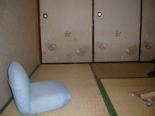 Another view of the room, showing the Japanese-style doors. The left door leads to the kitchen, while the right two open on a closet. In the foreground is a "floor-chair," you might call it--more suited to the traditional Japanese custom of sitting on the floor.