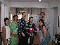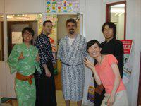 You see, in the summer, in Japan it is common for Japanese to enjoy festivities in yukata, a lighter version of kimono. They are quite cool, but it is a little embarrassing for us non-Japanese without slight builds. I actually taught for a day last week in the too-small yukata pictured here.