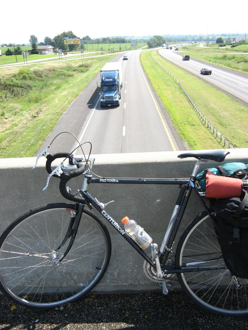 I reached I-70, the first road I was at all familiar with since I had left I-56 in Kansas almost a week ago. I found it strangely satisfying to have reached it, though I can't and wouldn't ride on it. I took pictures from an overpass as the semis honked at me from below.